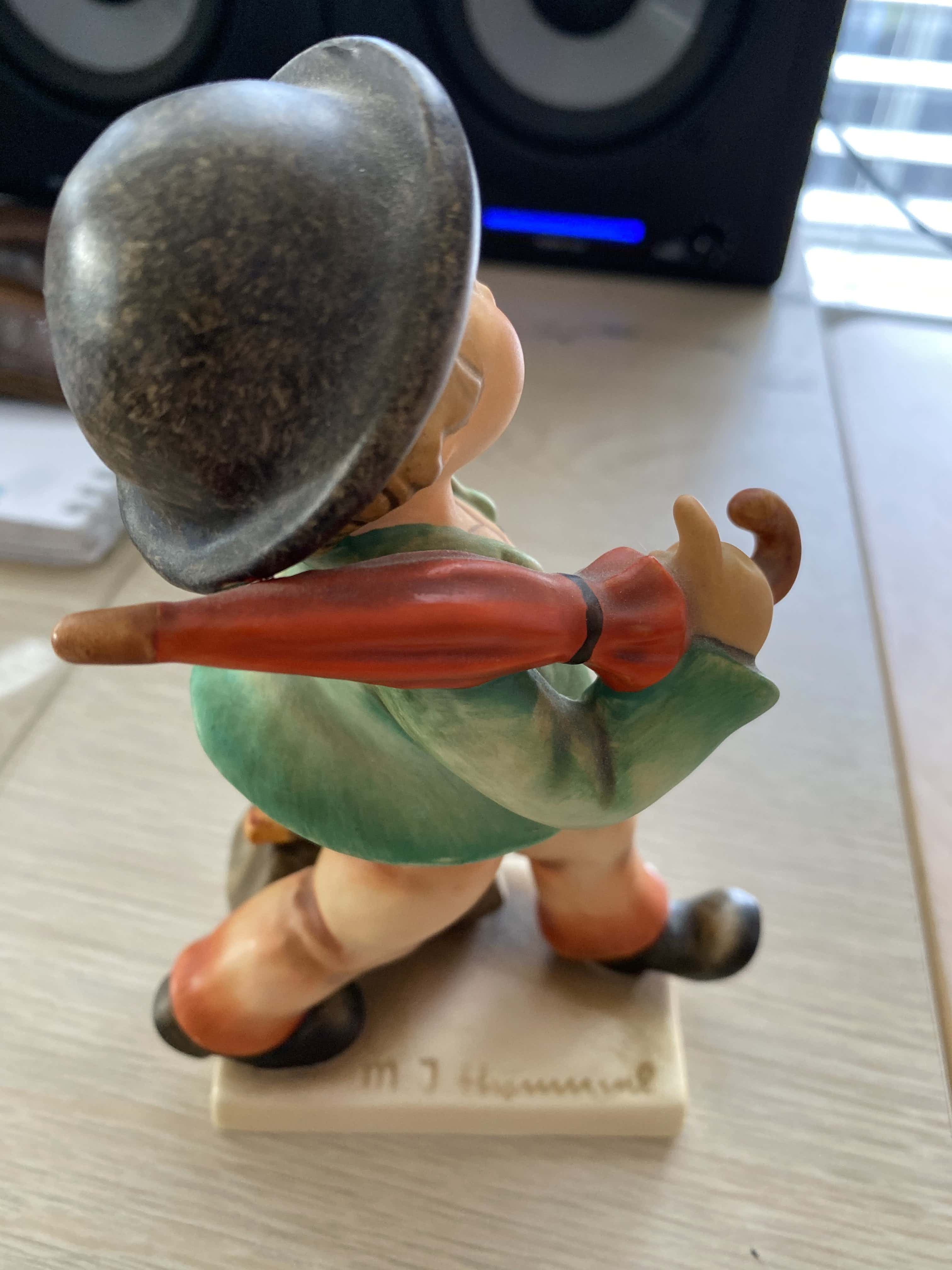 Dear Ralph, Thank you for your request and your patience. The apprised object is a porcelain figurine made by the manufacturer Goebel and after the designs of Maria Innocentia Hummel (1909-1946). The name of this model is "Merry Wanderer" and the hallmarks indicate that this piece was made between 1979-1990 (TMK-6). This piece is in good condition and there are no serious damages visible. An estimation would be between 30 to 60 USD. This estimation is based on actual recent past recorded auction sales of comparables. Retail "asking prices" can be higher and vary. With best regards, Georg